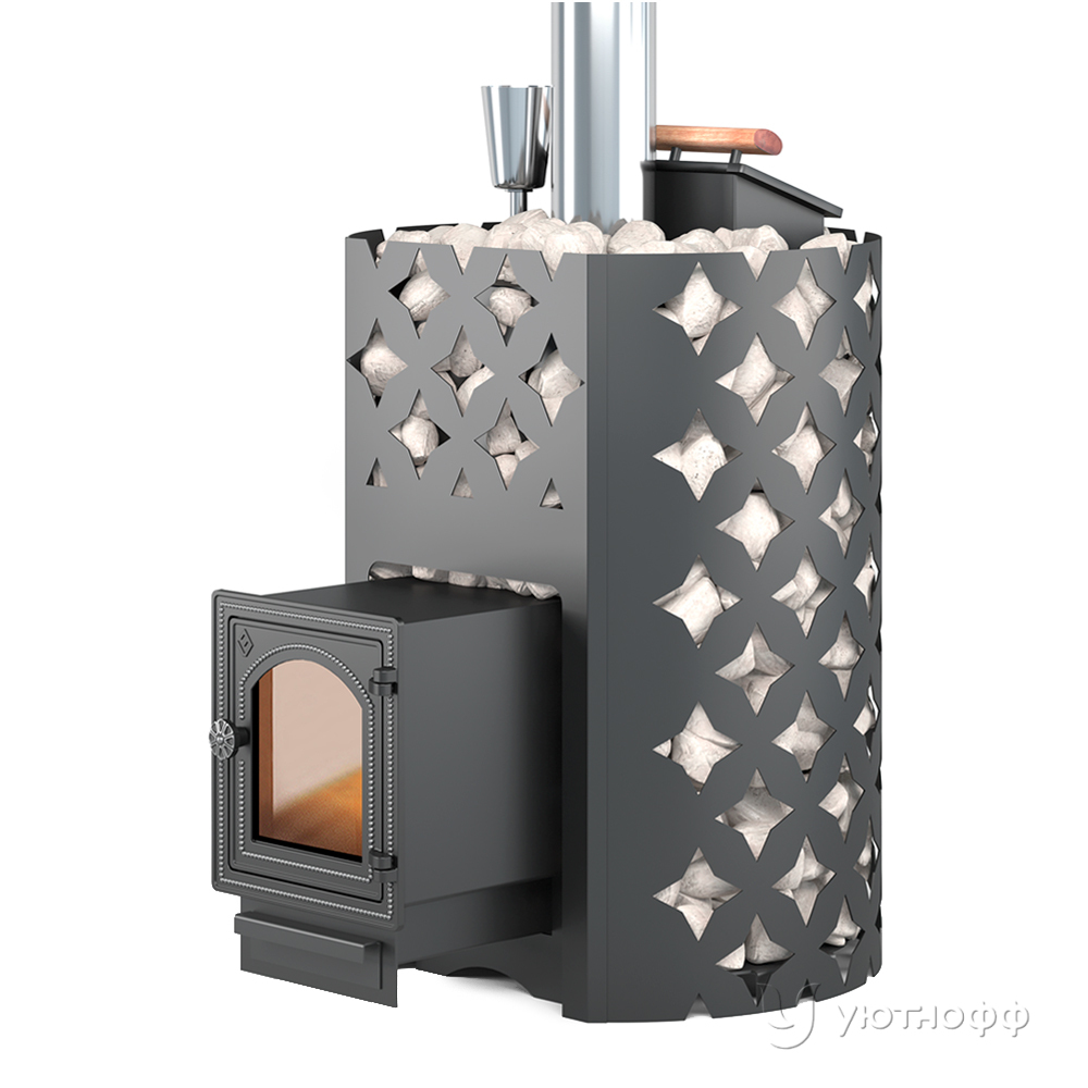 Банная чугунная печь Этна 18 (ДТ-4С) укомплектована чугунной дверцей ДТ-4С. Закрытая каменка изготовлена из стали и вмещает в себя не менее 60 кг камней. Для устройства наружной открытой каменки печь ЭТНА ЗК 18 оснащается металлическим кожухом с прорезным рисунком оригинального дизайна.
