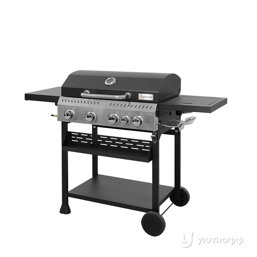 Удобство в газовом гриле Везувий обеспечивается за счет боковых столиков, на них удобно хранить инвентарь и посуду, ингредиенты для приготовления блюд, и за счет установленных пластиковых колес, облегчающих транспортировку и перемещение гриля по участку.