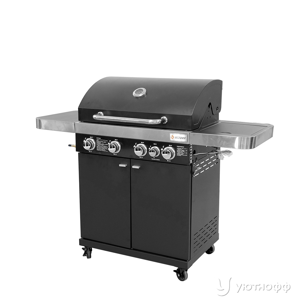 Удобство в газовом гриле Везувий обеспечивается за счет боковых столиков, на них удобно хранить инвентарь и посуду, ингредиенты для приготовления блюд, и за счет установленных пластиковых колес, облегчающих транспортировку и перемещение гриля по участку.