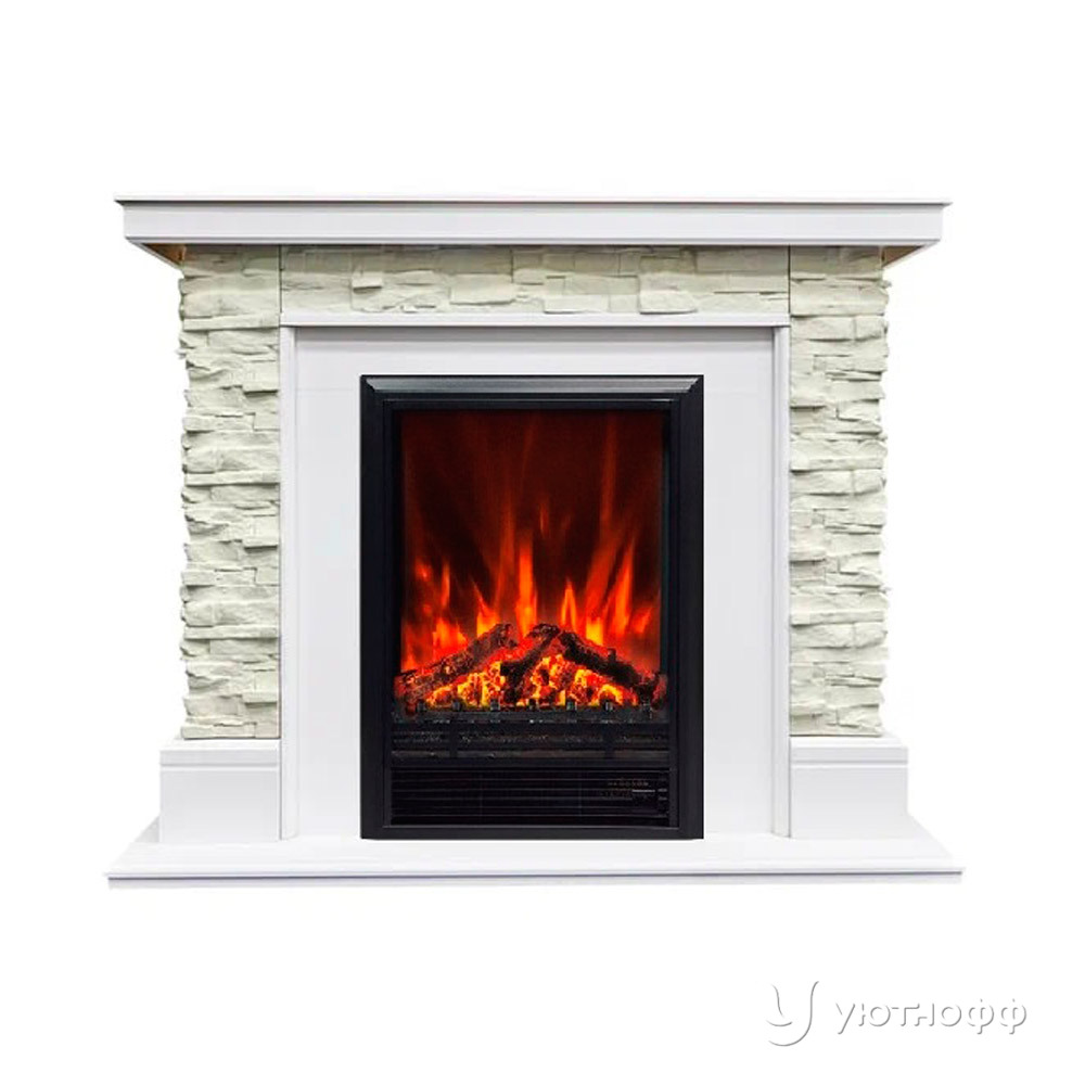 Новый бюджетный электрический камин в белом цвете с облицовкой из искусственного камня от компании RealFlame с классическим очагом Юджин.