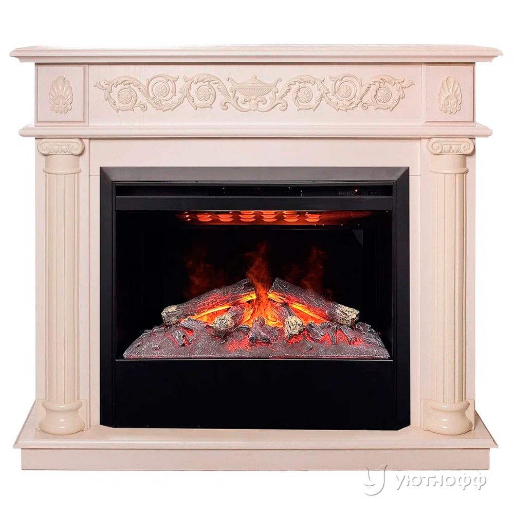 Новый портал Аттика в цвете белый дуб с декоративным элементами на фасаде и белыми колоннами комплектуется популярными моделями паровых очагов: