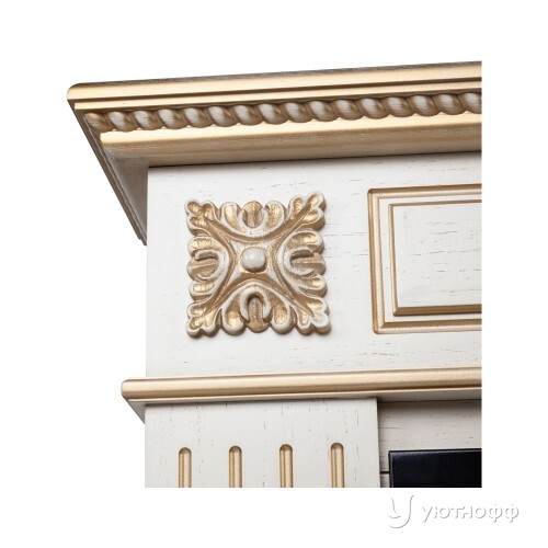 Современный широкий каминокомплект Siena 60 в цвете белый дуб с золотой патиной с очагом Saphir 60 станет превосходным украшением для просторного зала или гостиной комнаты.