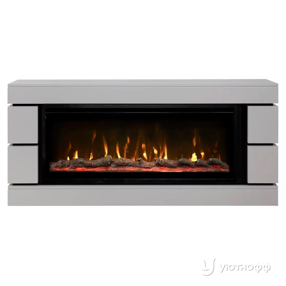 Современный широкий каминокомплект Seattle 42 выполнен из МДФ в платиновом цвете, что позволяет подчеркнуть яркое пламя во встроенном очаге.
