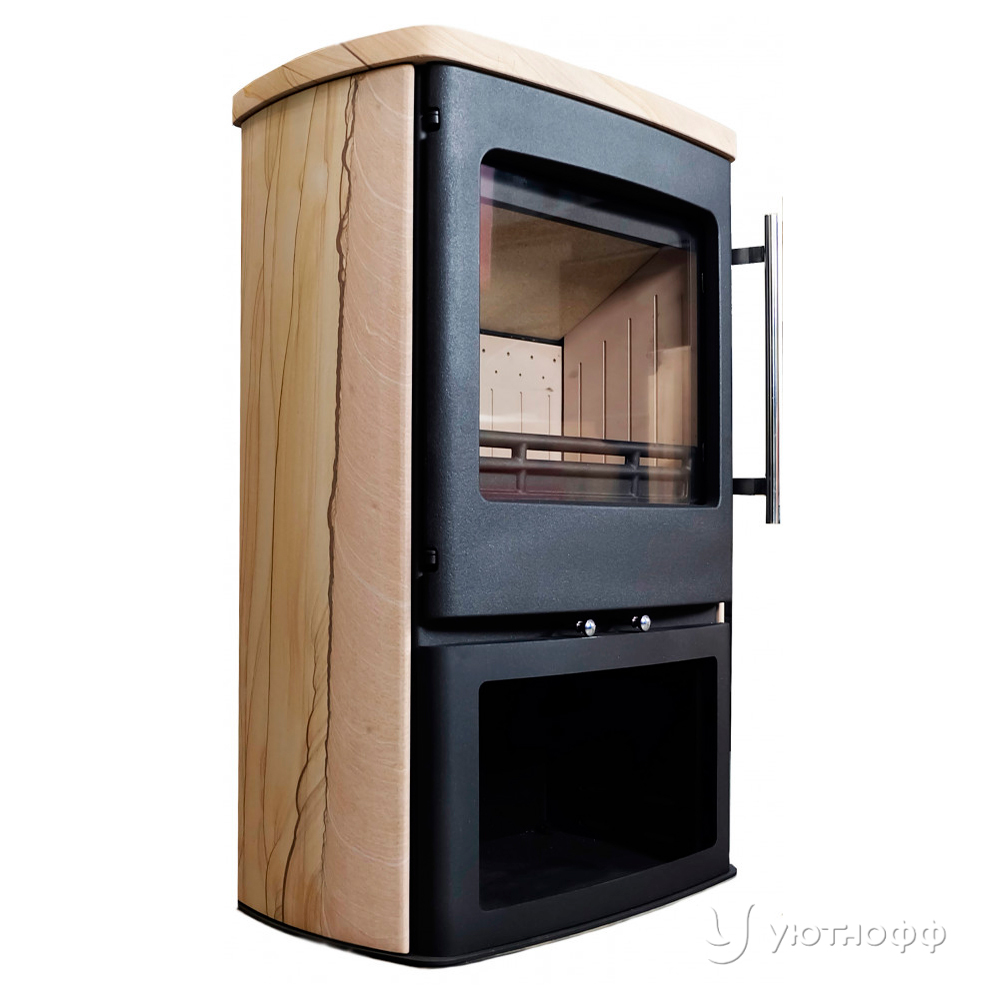 Корпус камина выполнен из стали, фасад и дверца из качественного чугуна, облицован каменными панелями из песчаника, а нижний отсек может использоваться для хранения дров, что делает использование печи более удобным.